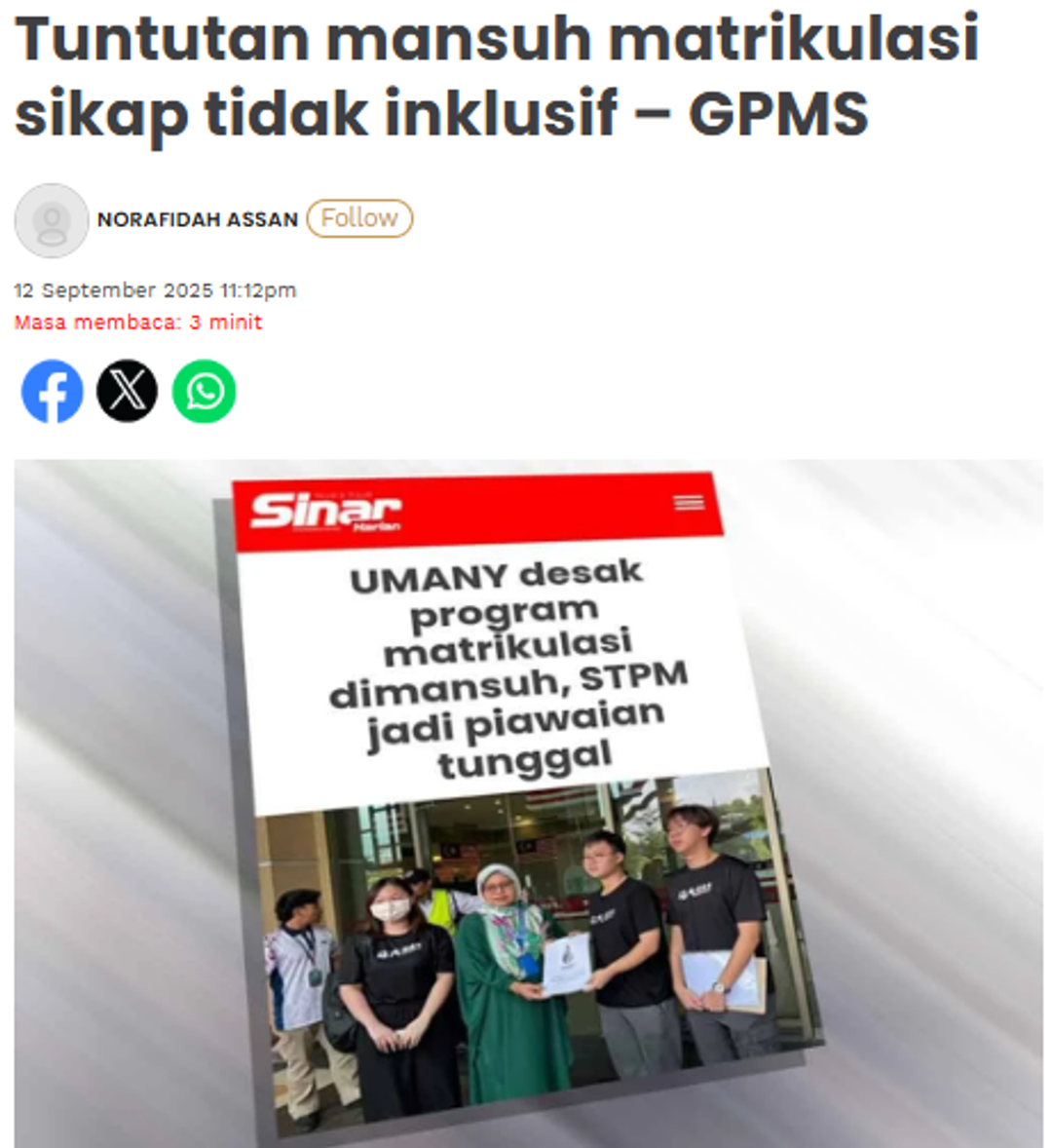 SINAR HARIAN : Tuntutan mansuh matrikulasi sikap tidak inklusif